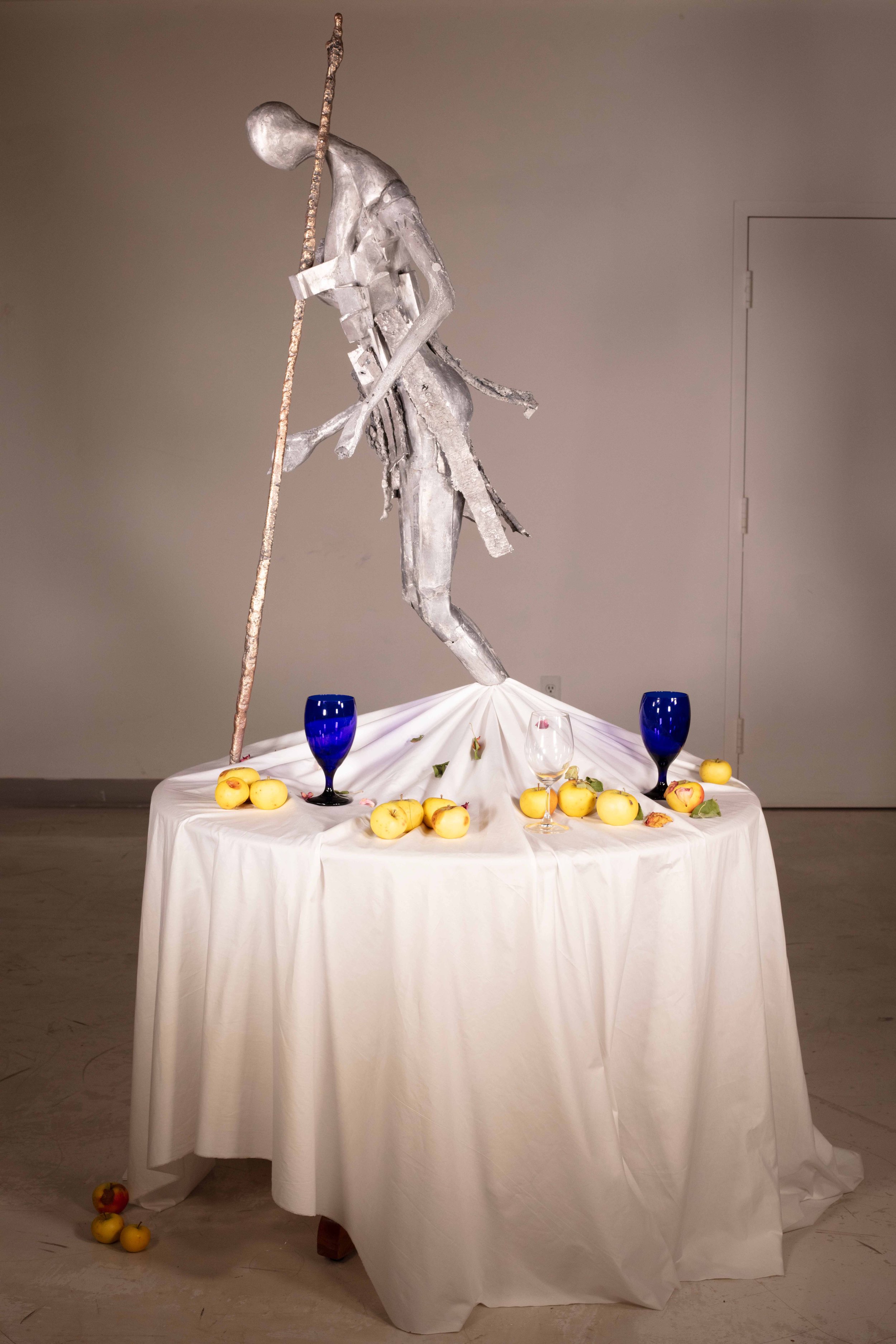 aluminum, bronze, steel, cotton fabric, found wine glasses, round wood table, rose petals, rotten apples